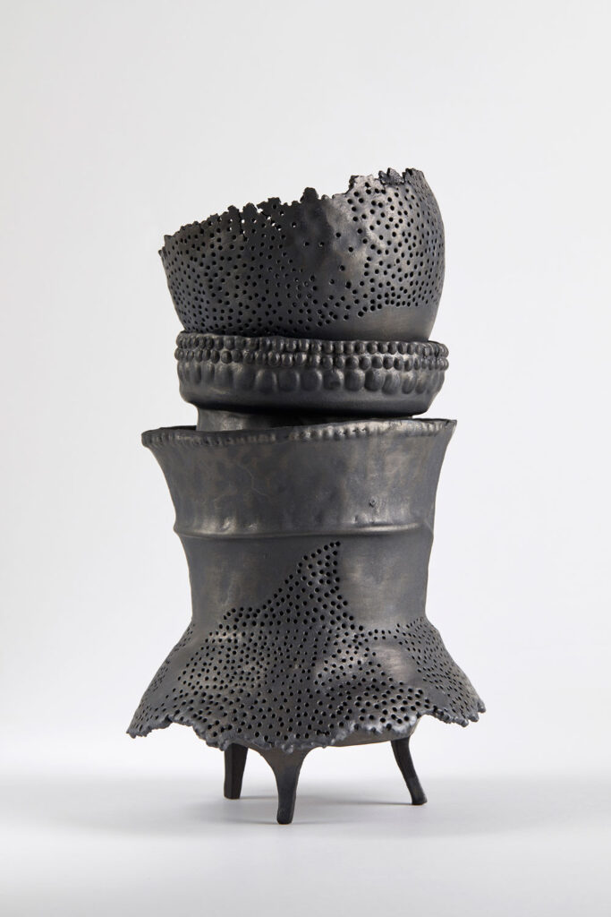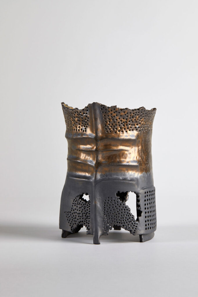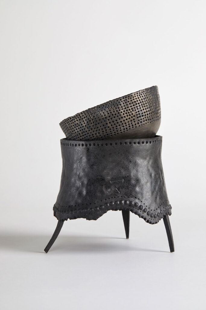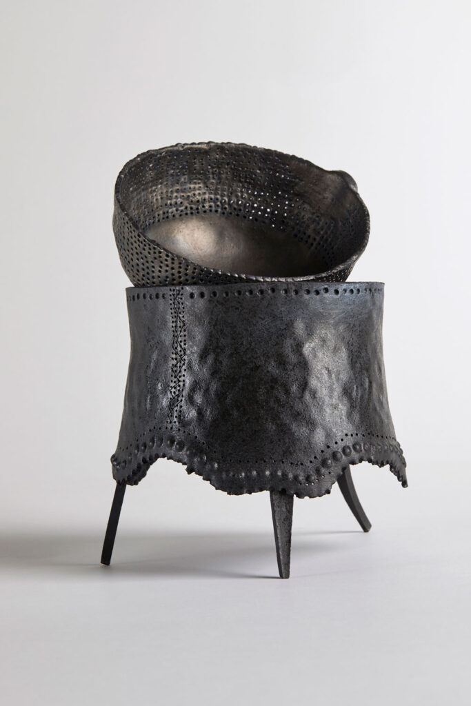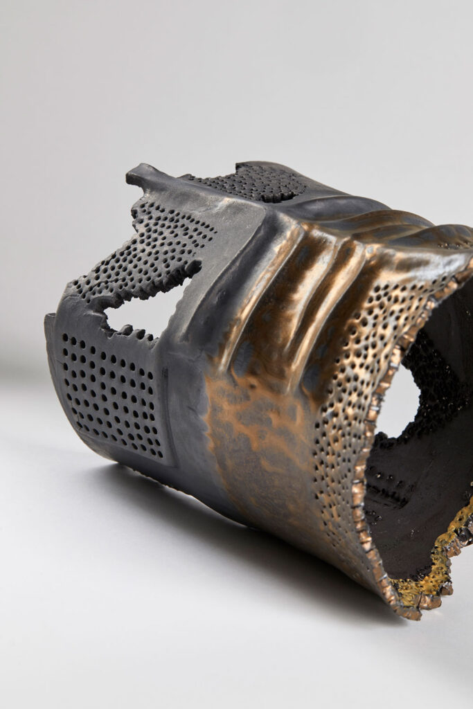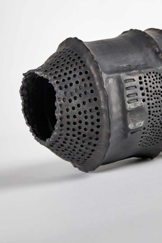 A fundamental tension in Cataphracts is the exploration of functionality versus dysfunctionality. While these ceramic forms bear the shape of vessels, their pierced surfaces make them impractical for holding liquids. Drapaniotou deliberately challenges this core aspect of ceramic tradition, pushing against the idea that a vessel’s purpose is to contain. This series invites viewers to question the limits of function in ceramic art, celebrating the form itself even when its practical use is denied.